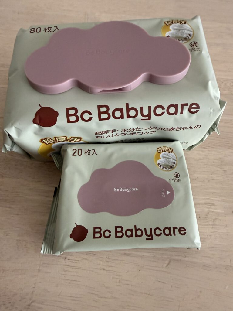 厚手で水分量が多いBc Babycareのおしりふき。携帯用も便利です。